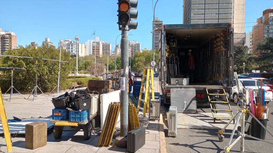 Es por eso que sobre la vereda de Casa de Gobierno, y frente a la Plaza Moreno, se armó un set de filmación que está deteniendo el tránsito de autos en la ciudad. Se recomienda utilizar calles aledañas ya que no se sabe en cuánto tiempo terminarán con la filmación de esa locación.