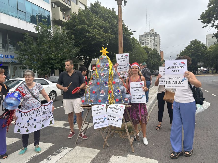 Con gorros y un arbolito de Navidad, vecinos de Gonnet se fueron hasta las puertas de Absa para reclamar por falta de agua. Según indicaron, el problema data desde 1995 pero en los últimos años empeoró.