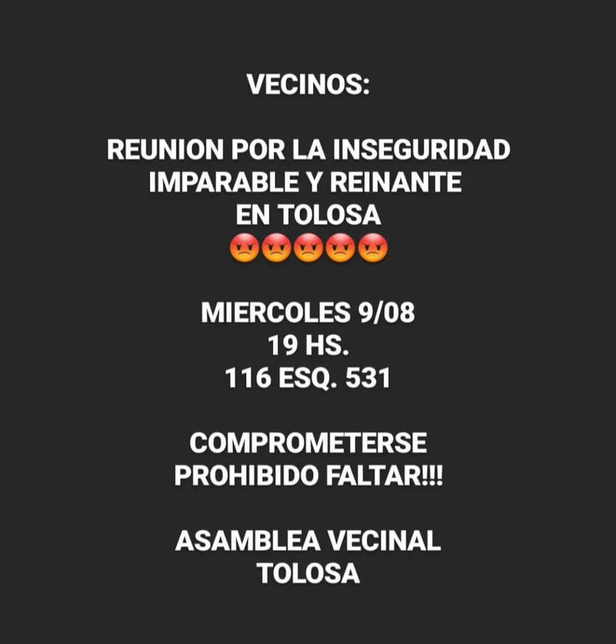 Desde la Asamblea Vecinal de Tolosa convocaron a una reunión en contra la inseguridad que sufren día a día en dicha zona. El encuentro se llevará a cabo este miércoles 9 a las 19 hs en 116 esq. 531 para determinar qué hacer y cómo continuar con esta situación de hartazgo.