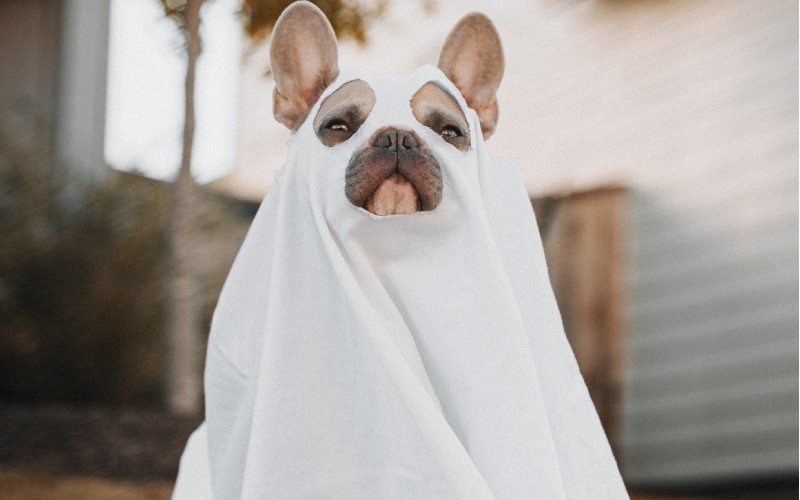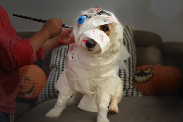 También con algunos pedazos de tela blanca o de papel, podés disfrazar de momia a tu perrito. Recordá no apretarle demasiado y siempre prestar atención a que no le moleste: