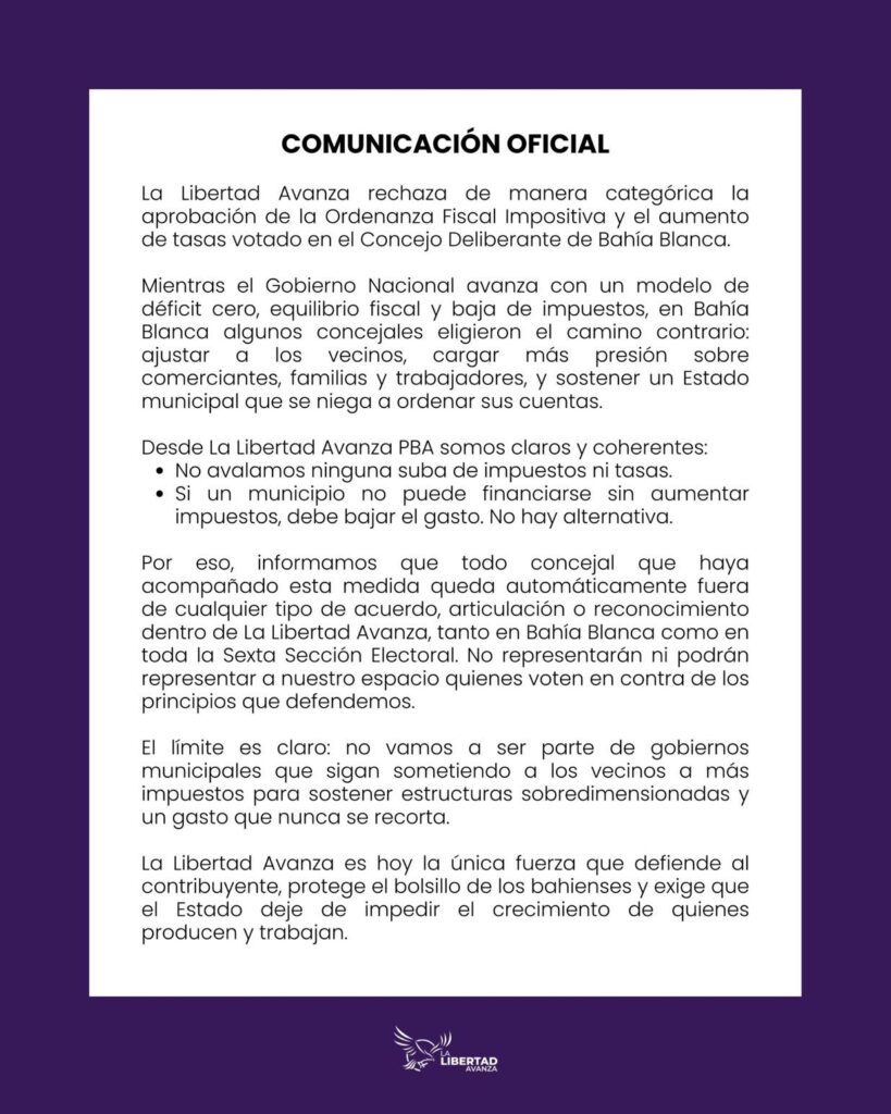 Horas más tarde, LLA difundió un comunicado oficial ampliando esa postura. La fuerza rechazó “de manera categórica” la aprobación de la ordenanza fiscal y la suba de tasas en Bahía Blanca, calificando la decisión como contraria al modelo de equilibrio fiscal impulsado por el Gobierno nacional. El documento remarcó que el espacio “no avala ninguna suba de impuestos ni tasas” y que los municipios deben ordenar el gasto antes que recurrir a incrementos que “ajustan a comerciantes, familias y trabajadores”.