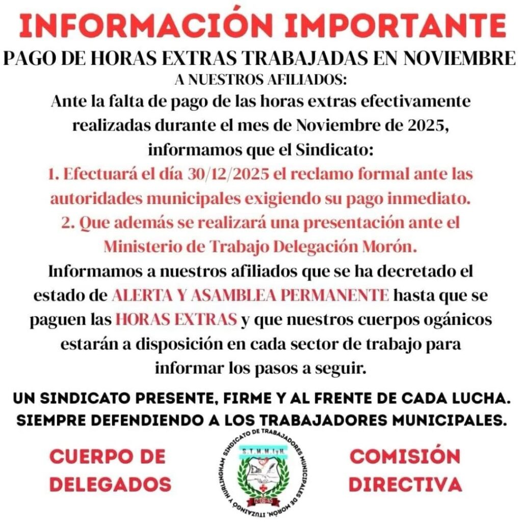 Desde el gremio denuncian que la situación ocurre por segundo mes consecutivo y remarcan que las horas extras son fundamentales para los ingresos de los empleados comunales ante los bajos Salarios que percibe la mayoría de los trabajadores.
