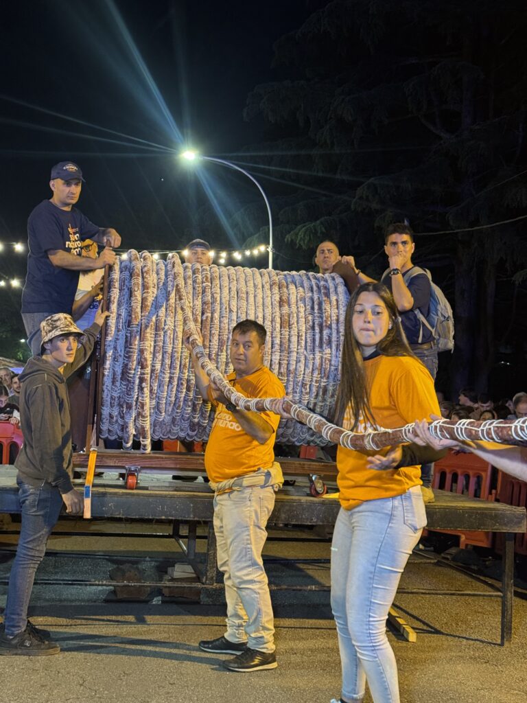 El salame llegó al predio en un camión especialmente acondicionado, enrollado en un enorme carretel de madera, una novedad que reemplazó la estructura metálica usada en ediciones anteriores. Más de 40 voluntarios y productores fueron los encargados de desplegarlo, medirlo y volver a enrollarlo frente al público que siguió la escena con emoción.