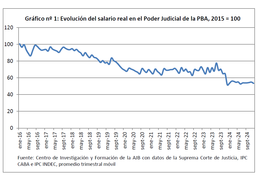 En números, esto implicaría unos 2,49 billones de pesos del presupuesto provincial al Poder Judicial. Según la AJB, con esta cifra se podría recomponer salarios, cubrir cargos vacantes y hacer mejoras edilicias, entre otras cosas básicas. “Esta proyección, sin embargo, no resuelve ninguno de los problemas estructurales”, aclararon.