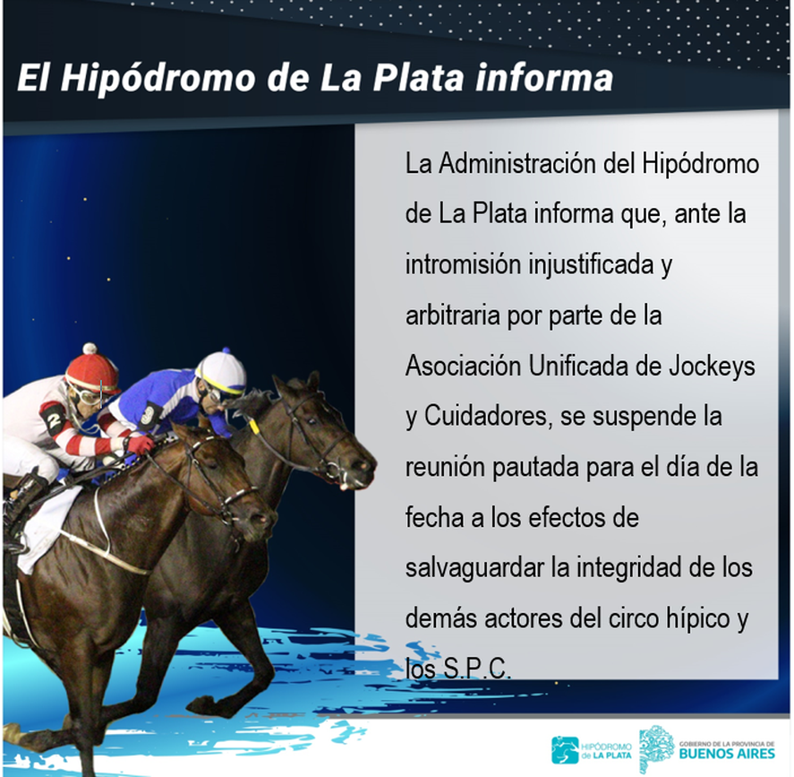 Cabe recordar que la la Asociación Unificada de Jockeys y Cuidadores llevaba adelante una medida de fuerza en reclamo de pagos atrasados de premios, mejoras en el predio y más mantenimiento. Por éste motivo, desde la institución llevaban adelante reuniones con representantes sindicales.