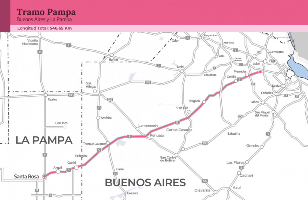 El tercer tramo a privatizar en esta segunda etapa de licitación es el llamado Pampa. Se trata de otro enclave fundamental para el territorio bonaerense ya que lo atraviesa desde el centro hasta el Oeste conectándolo con la provincia de La Pampa. Concretamente, son 546 kilómetros de la ruta 5 y van desde Luján hasta Santa Rosa.