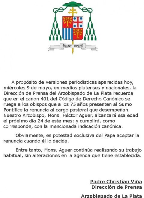 En la misiva emitida oficialmente, se aclara: “A propósito de versiones periodísticas aparecidas hoy, la Dirección de Prensa del Arzobispado de La Plata recuerda que en el canon 401 del Código de Derecho Canónico se ruega a los obispos que a los 75 años presenten al Sumo Pontífice la renuncia al cargo pastoral que desempeñan. Nuestro Arzobispo, Mons. Héctor Aguer, alcanzará esa edad el próximo día 24 de este mes; y cumplirá, como corresponde, con la mencionada indicación canónica”.