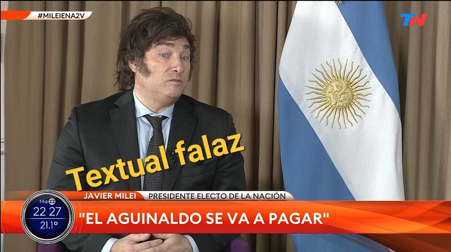 Es decir, o sea, digamos, que nunca salió de su boca el textual de “El aguinaldo se va a pagar”, que segundos después colocó la producción de “A dos Voces” en el zócalo y muchos libertarios replicaron a manera de captura de pantalla en redes, para argumentar que era mentira lo que el propio Milei le había especificado a Telefé.