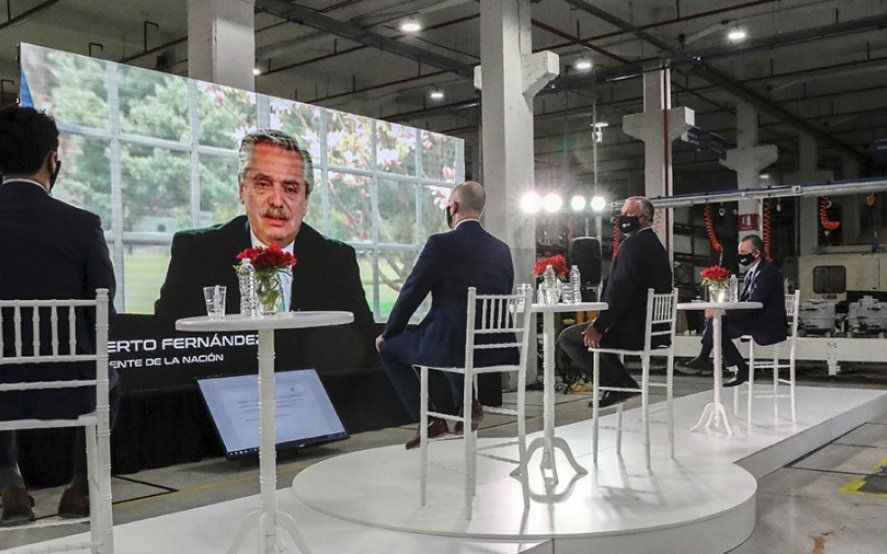 El presidente Alberto Fernández participó por videoconferencia del acto de inauguración de la línea de fabricación de lavarropas del Grupo Newsan en su planta del partido bonaerense de Avellaneda. Del evento participó también de manera virtual el gobernador de la provincia de Buenos Aires, Axel Kicillof.