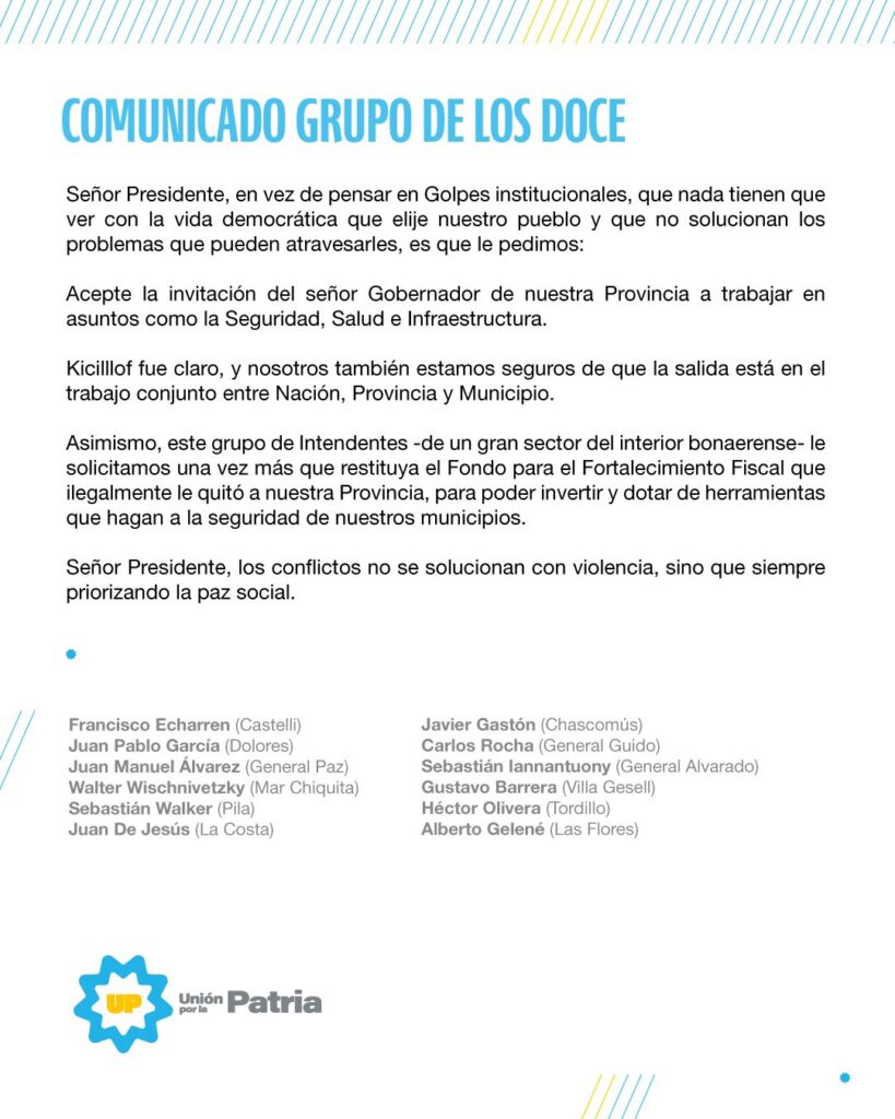 Los intendentes oficialistas de la Quinta Sección Electoral, que ya habían pedido la restitución de fondos de seguridad, también salieron en defensa de Kicillof. A través de un comunicado firmado por 12 alcaldes, le solicitaron que “en vez de pensar en golpes institucionales” le acepte la invitación al gobernador bonaerense para trabajar en conjunto.