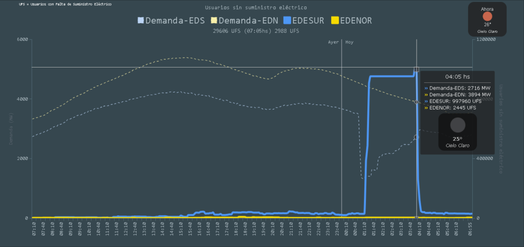 Según el Ente Nacional Regulador de la Electricidad (ENRE), el corte de luz fue repentino y empezó a la 1 de la mañana. En cuestión de minutos, pasó a haber 952.036 usuarios sin suministro eléctrico, todos del área concesionada a la empresa EDESUR. El peor momento fue a las 4 de la madrugada, unos minutos de que la situación empiece a normalizarse, cuando el ENRE informó un total de 998.414 usuarios sin luz, es decir el 37% de todos los usuarios.