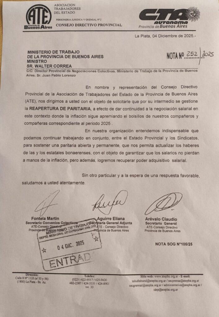 En los fundamentos del escrito, el sindicato remarcó que resulta “indispensable” sostener una negociación permanente entre el Estado provincial y las organizaciones gremiales, con el objetivo de “actualizar los haberes de las y los estatales bonaerenses” y garantizar que los salarios “no pierdan a manos de la inflación”. También insistieron en que la revisión salarial debe apuntar a “recuperar poder adquisitivo” luego de un año marcado por la caída real de los ingresos.