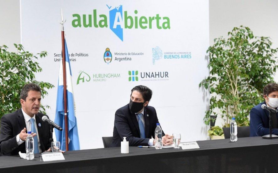 El presidente de la Cámara de Diputados de la Nación, Sergio Massa, y el gobernador de la provincia de Buenos Aires, Axel Kicillof, participaron hoy en el partido de Hurlingham del lanzamiento de “Aula Abierta”, una plataforma gratuita de educación a distancia para niveles primario y secundario.