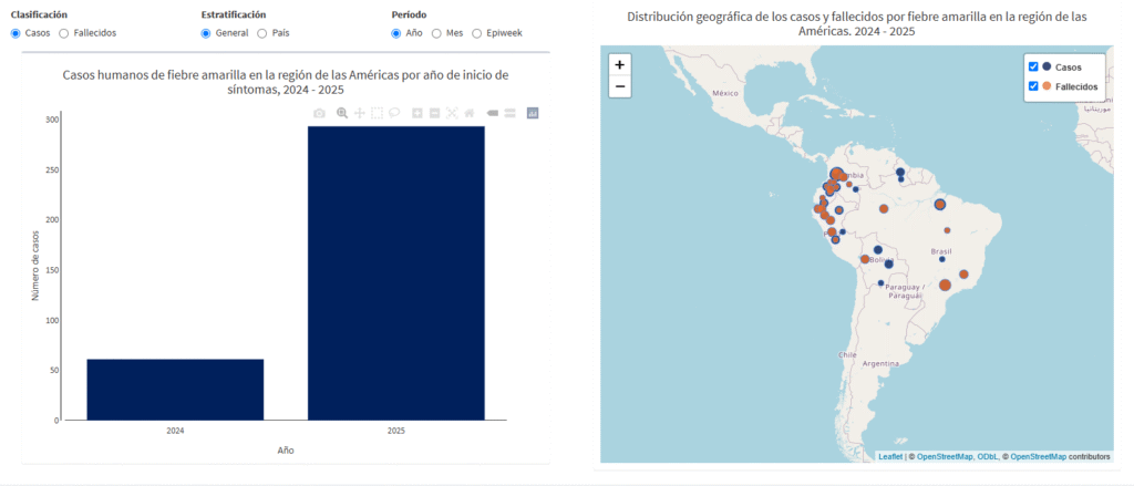 Según la Organización Panamericana de la Salud (OPS), este año se confirmaron 354 casos de fiebre amarilla en América del Sur, principalmente en Brasil y Colombia, incluyendo a 151 personas fallecidas. A esta altura del 2024, el mismo organismo reportaba unos 61 casos por lo que se trata de un aumento interanual del 480%.