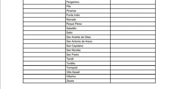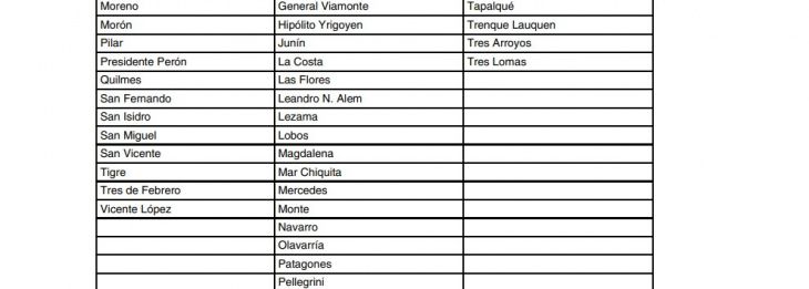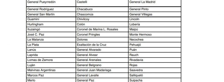 Se trata de Almirante Brown, Avellaneda, Berazategui, Berisso, Bragado, Cañuelas, Ensenada, Escobar, Esteban Echeverría, Ezeiza, Florencio Varela, General Las Heras, General Pueyrredón, General Rodríguez, General San Martín, Guaminí, Hurlingham, Ituzaingó, José C. Paz y La Matanza.