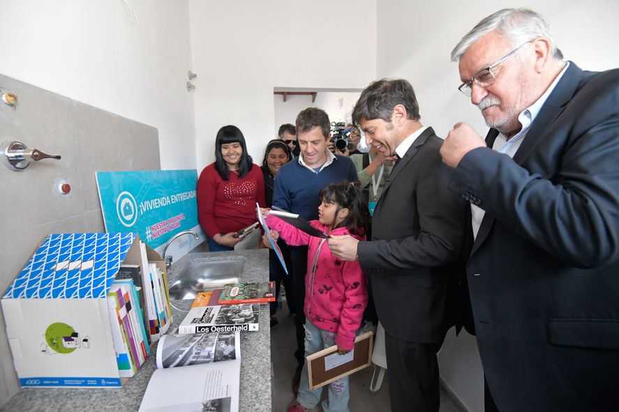 El gobernador de la provincia de Buenos Aires, Axel Kicillof, acompañado por el intendente local, Vicente Gatica, entregó 24 viviendas a familias de Bragado en el marco del programa Solidaridad con Municipios.