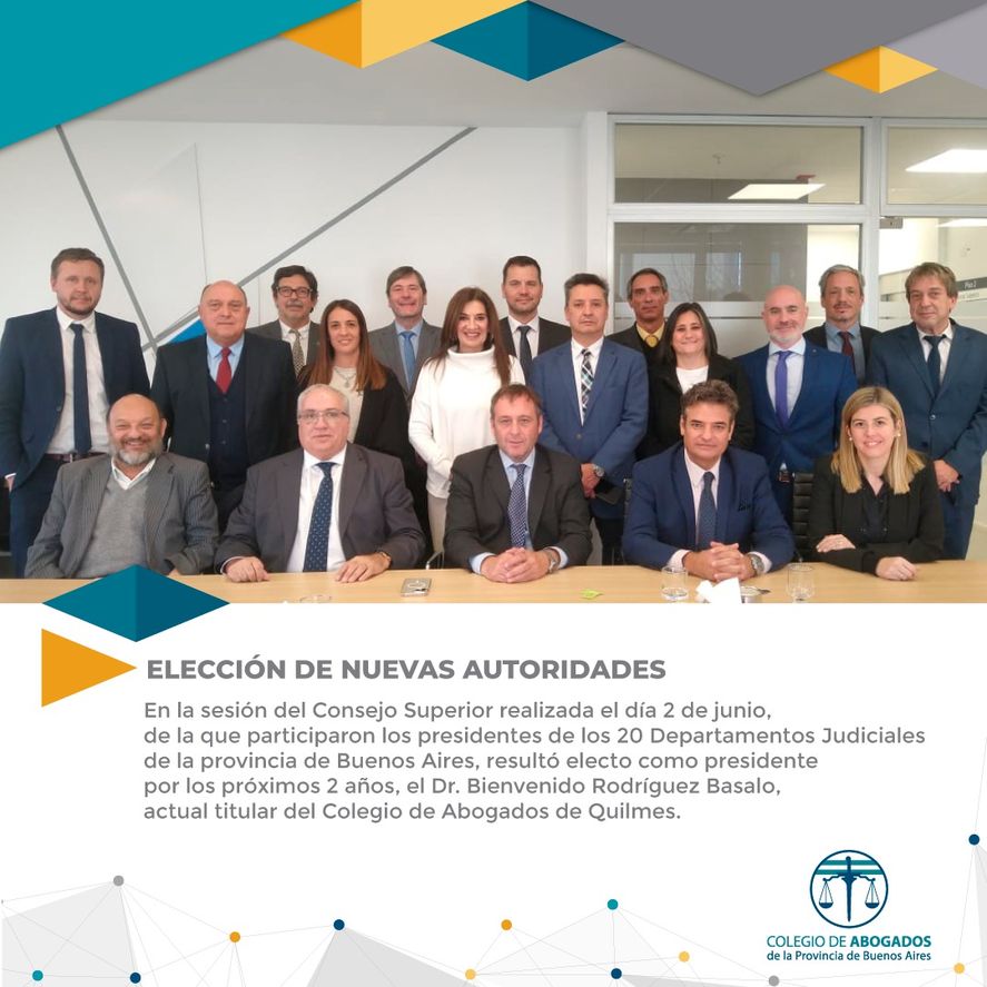 El actual titular del Colegio de Abogados de Quilmes, Dr. Bienvenido Rodríguez Basalo, fue electo presidente del Consejo Superior del Colegio de Abogados de la provincia de Buenos Aires (COLPROBA), en las elecciones realizadas el pasado 2 de junio de la que participaron los titulares de los 20 departamentos judiciales que conforman la provincia de Buenos Aires.