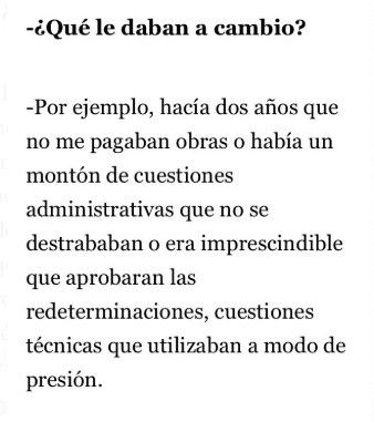 A través de una entrevista que concedió hoy al diario La Nación, Calcaterra aceptó haber entregado dinero a funcionarios del Gobierno anterior, pero fue consultado respecto de “qué le daban a cambio”. En ese contexto, enumeró una serie de “beneficios” para su empresa, que supuestamente ‘destrababa’ el pago de las coimas: “por ejemplo hacía dos años que no me pagaban obras o había un montón de cuestiones administrativas que no se destrababan o era imprescindible que aprobaran las redeterminaciones, cuestiones técnicas que utilizaban a modo de presión”, admitió Calcaterra.