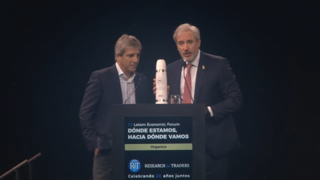 El foro empresario en el que habló Caputo fue creado por Dario Epstein, el economista que dirige la consultora Research for Traders. Él mismo se subió al escenario luego del discurso de Caputo con dos regalos: un libro y un termo de la fundación del Hospital Gutiérrez.
