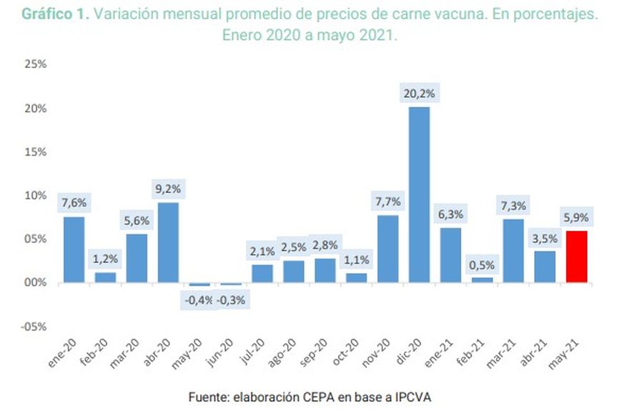 Los primeros datos que se conocen de la evolución de los precios de la carne en el mes de mayo muestran que la tendencia alcista de los precios continúa profundizándose, al registrar un aumento del 5,9%. El CEPA señala además que los cortes más económicos aumentaron esta vez por encima del promedio: 7,8%.