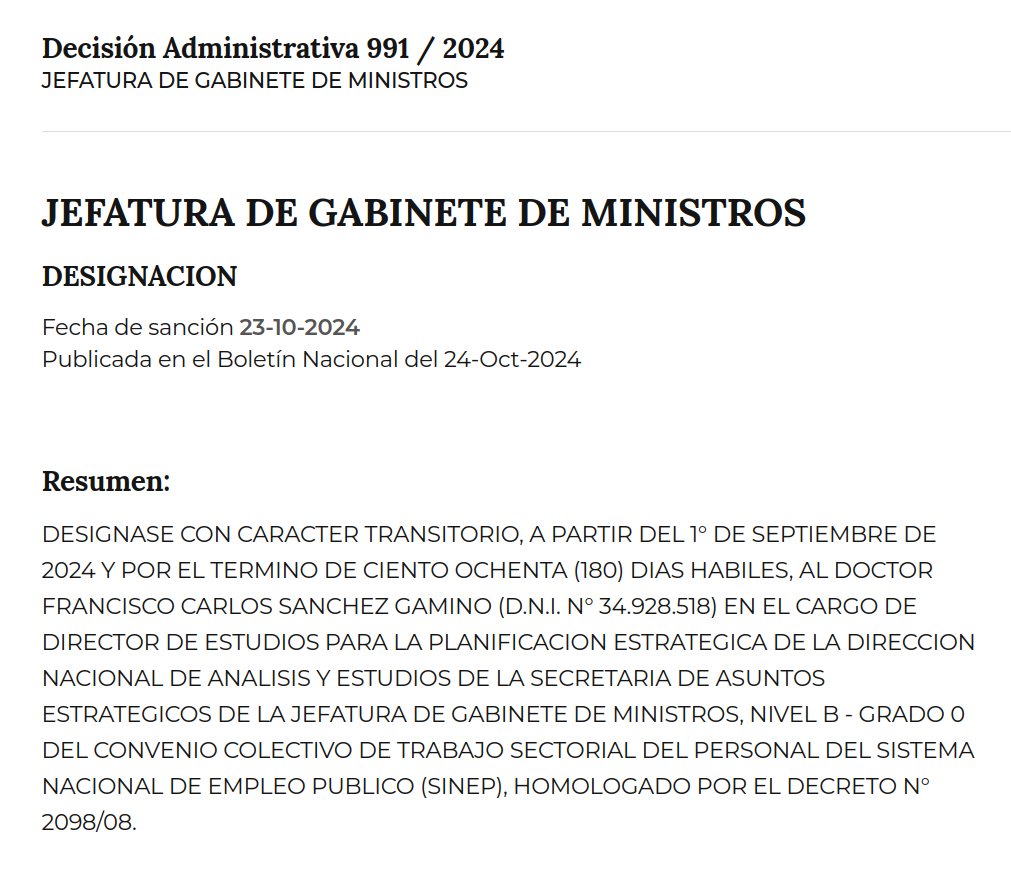Sánchez Gamino fue designado oficialmente en septiembre de 2024 como “Director de Estudios para la Planificación Estratégica en la Dirección Nacional de Análisis y Estudios de la Secretaría de Asuntos Estratégicos“, esos puestos que pocos saben para que sirven.