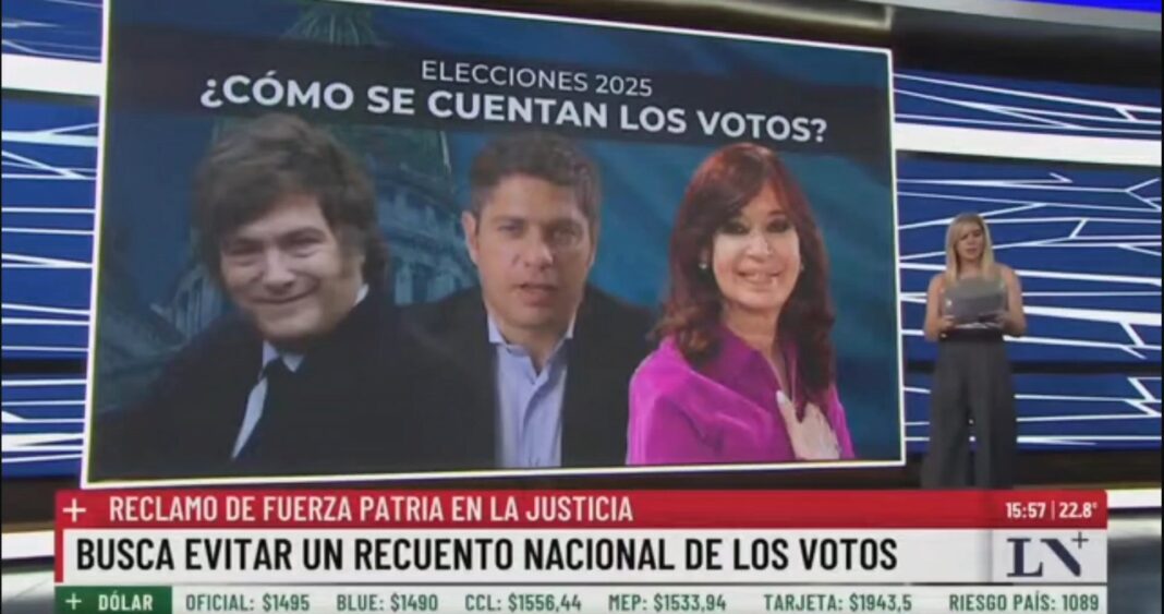 Plager, con tono de analista imparcial, en realidad abre la puerta al relato oficial: “Para evitar que La Libertad Avanza quede como la fuerza más votada a nivel nacional, Fuerza Patria se presenta … y dice, ‘No, no queremos que el recuento se dé a nivel nacional’.”