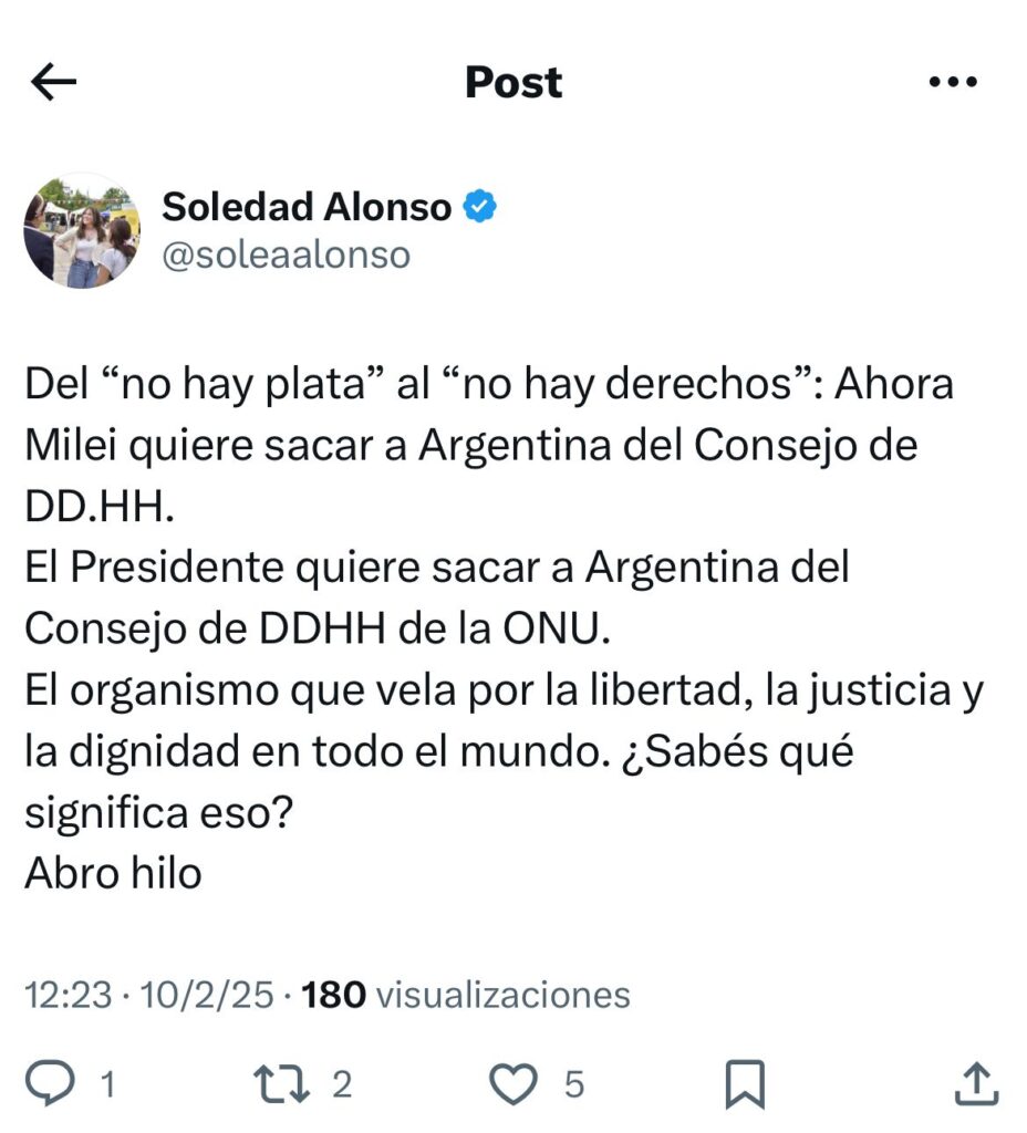 “Del “no hay plata” al “no hay derechos”: Ahora Milei quiere sacar a Argentina del Consejo de DD.HH. El Presidente quiere sacar a Argentina del Consejo de DDHH de la ONU. El organismo que vela por la libertad, la justicia y la dignidad en todo el mundo”, comienza diciendo Soledad Alonso, diputada peronista en X.