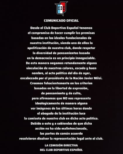 “De esta manera negamos rotundamente alguna vinculación de nuestros colores, escudo y buen nombre, al acto político del día de ayer, encabezado por el presidente de la nación Javier Milei. Creemos fehacientemente en los criterios basados en la libertad de expresión, de pensamiento y de culto, pero afirmamos que no nos representa ideológicamente de manera alguna ver imágenes de las últimas horas donde el abogado de la institución luce la camiseta de nuestro club en dicho acto político”.