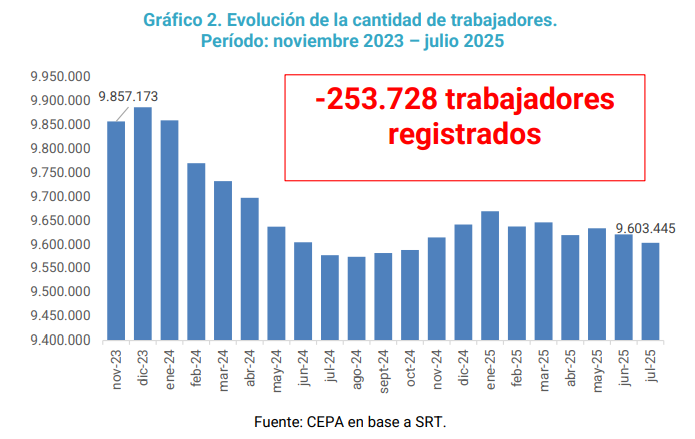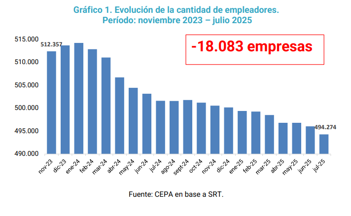 Según un informe del Centro de Economía Política Argentina (CEPA), basado en datos oficiales, entre noviembre de 2023 y julio de 2025 cerraron más de 18 mil empresas y se destruyeron más de 250 mil puestos de trabajo registrados. Transporte, construcción e industria encabezan la lista de los sectores más golpeados.