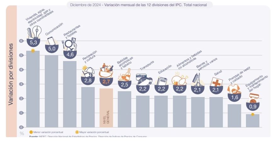 A pesar de esta desaceleración anual, diciembre mostró un leve repunte respecto a noviembre, con un alza mensual del 2,7%. Vivienda, agua, electricidad, gas y otros combustibles lideraron las subas con un incremento del 5,3%, impulsado por ajustes en alquileres y servicios. En paralelo, el rubro Comunicación creció un 5%, mientras que Alimentos y bebidas no alcohólicas, si bien tuvo un aumento menor (2,2%), fue la categoría de mayor incidencia en el índice general, especialmente por subas en carnes, pan y productos lácteos.