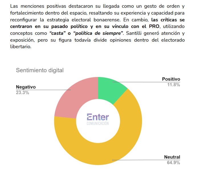 Sin embargo, el análisis de las menciones en torno a la candidatura de Diego Santilli dentro de La Libertad Avanza muestra una conversación de volumen moderado pero creciente y tono mayormente neutral, “con un 64,9% de publicaciones informativas, un 23,3% negativas y un 11,8% positivas”.