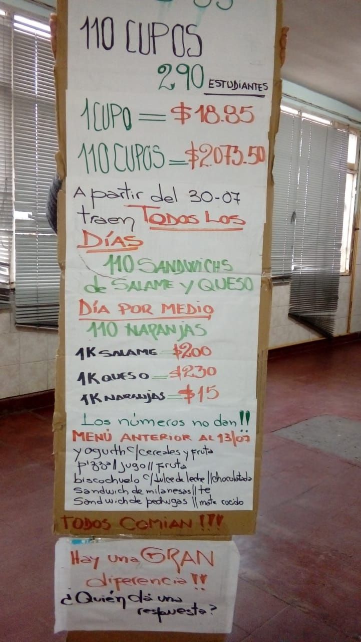 Una situación similar se puede observar en La Matanza. Gabriel es director de la escuela secundaria 170 de Laferrere. “Tenemos un cupo de 13 pesos para 170 chicos y la matrícula es de 275 alumnos”, marca. “El menú es una vez a la semana una figaza con jamón y queso, otro día una factura o puede tocar un turrón por chico. Es para lo que alcanza”, añade.