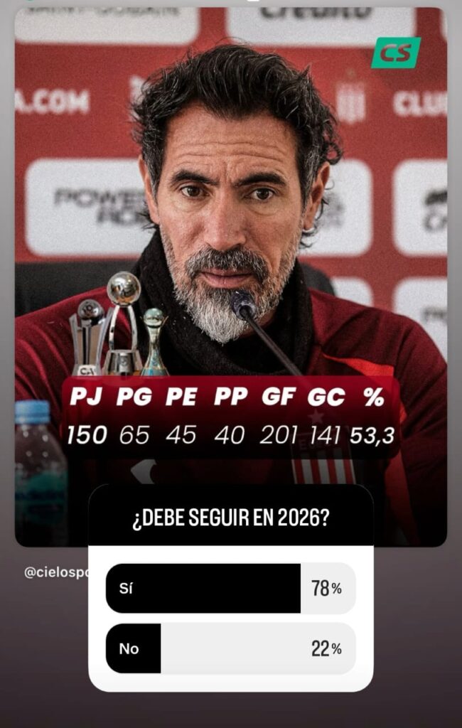 La cuestión es que, ante este escenario, Cielosports hizo una encuesta a través de su IG sobre si el Barba debía seguir o no en el 2026 y la respuesta de los hinchas fue contundente: el 78% votó por la positiva, por lo cual es un gran respaldo para el entrenador, a pesar de que hoy el equipo está en una situación incómoda en la tabla anual, afuera de todas las Copas y dependiendo del resto.