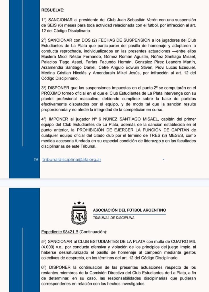 Por su parte, uno de los más perjudicados fue Juan Sebastián Verón, presidente del club, quien recibió una suspensión por 6 meses para toda actividad relacionada con el fútbol. El capitán del equipo, que ante las ausencias de Ascacibar y Carrillo fue Santiago Núñez, tampoco se salvó: además de las dos fechas, se le aplicará la prohibición de ejercer la capitanía por 3 meses.