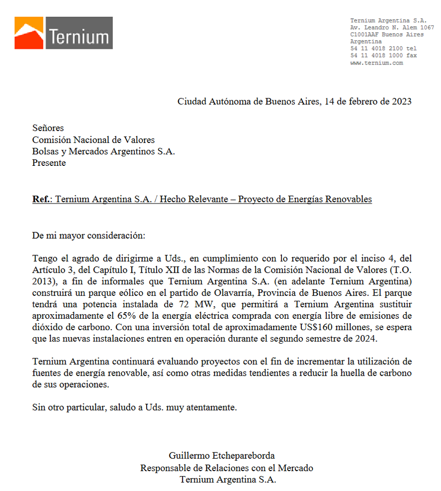 En la jornada del martes, la siderúrgica Ternium del grupo Techint realizó una presentación formal ante la Comisión Nacional de Valores, Bolsas y Mercados para avanzar en la construcción de un parque eólico en la localidad bonaerense de Olavarría.