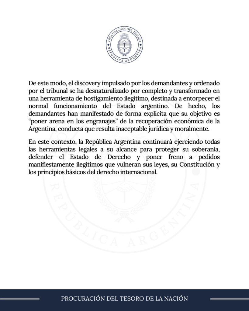 Sin embargo, cuando ese mismo sistema actúa conforme a sus reglas y permite que los fondos litigantes avancen en la búsqueda de activos, el oficialismo ensaya un discurso de víctima y denuncia “hostigamiento sistemático” contra el Estado argentino.