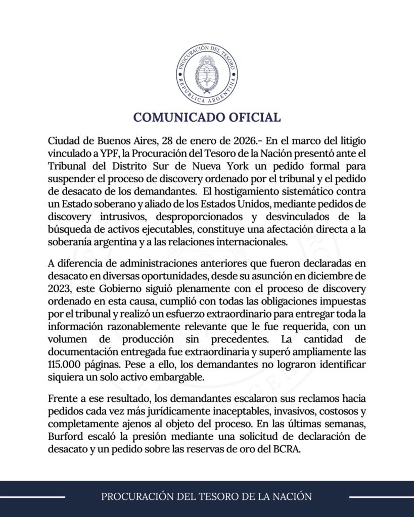 El (duro?) comunicado difundido por la Procuración del Tesoro argentino en el marco del juicio por la expropiación de YPF en tribunales de Nueva York intenta construir una imagen de firmeza institucional y defensa de la soberanía frente a los fondos de inversión más poderosos del mundo.