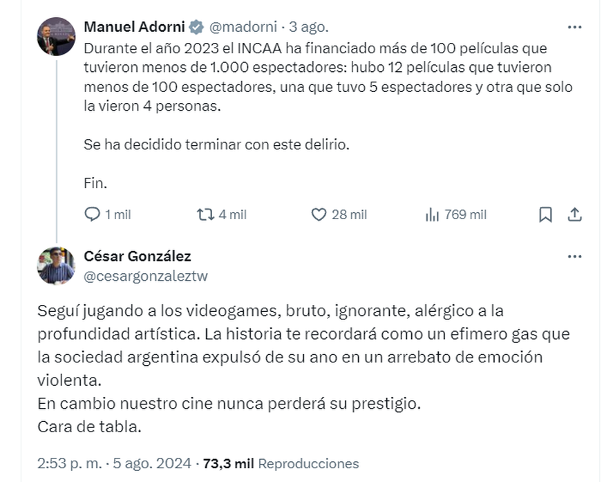 A raíz de esta medida, el vocero presidencial Manuel Adorni publicó: “Durante el año 2023 el INCAA ha financiado más de 100 películas que tuvieron menos de 1.000 espectadores: hubo 12 películas que tuvieron menos de 100 espectadores, una que tuvo 5 espectadores y otra que solo la vieron 4 personas. Se ha decidido terminar con este delirio. Fin”, lo que generó una catarata de comentarios a favor y en contra.