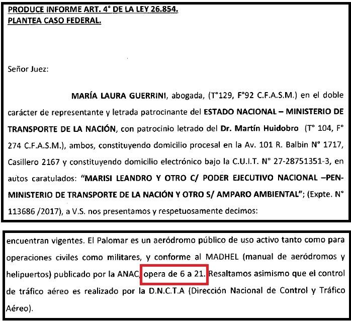 Presentación del Ministerio de Transporte de la Nación ante la Justicia Federal informando que el aeropuerto El Palomar no iba a operar de noche.