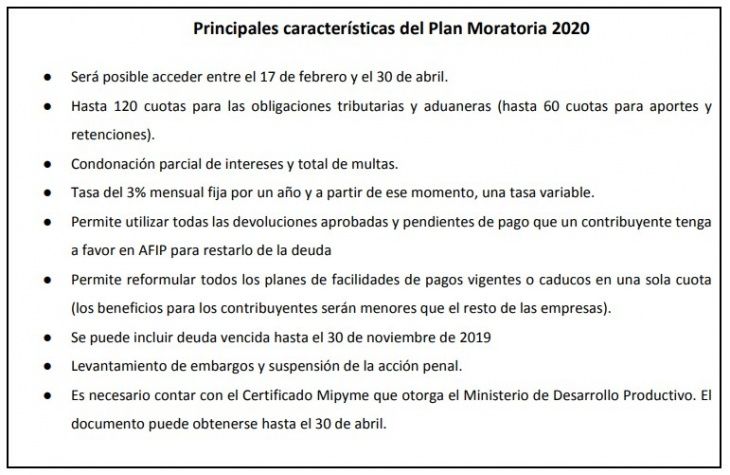 Ante la crisis, la moratoria permite refinanciar en plazos de hasta 10 años toda la deuda impositiva, aduanera y de la seguridad social que tenga un contribuyente y pagar una única cuota mensual. La iniciativa prevé la condonación parcial de intereses y total de multas.