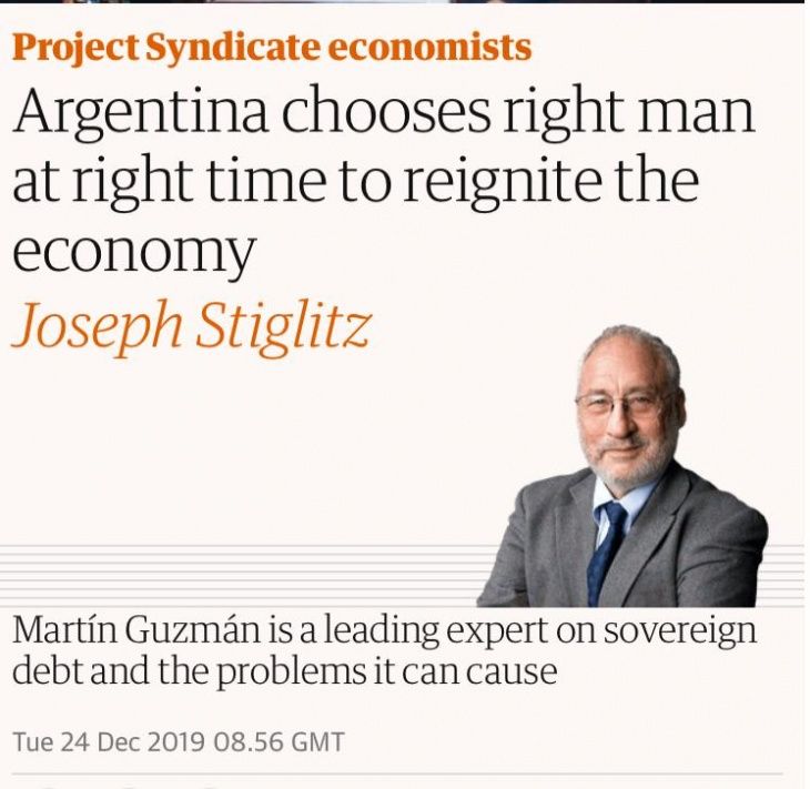 El profesor universitario de la Universidad de Columbia y economista jefe del Instituto Roosevelt escribió en su nota en The Guardian: “A juzgar por su nombramiento de un economista de primera línea en su gabinete como ministro de economía, el nuevo presidente de Argentina, Alberto Fernández, ha tenido un buen comienzo al enfrentar los problemas económicos de su país. Martín Guzmán, con quien he colaborado frecuentemente en los últimos años, se encuentra entre los principales expertos del mundo en deuda soberana y los problemas que ésta puede causar, lo que lo convierte en la persona adecuada en el lugar correcto y en el momento oportuno”.