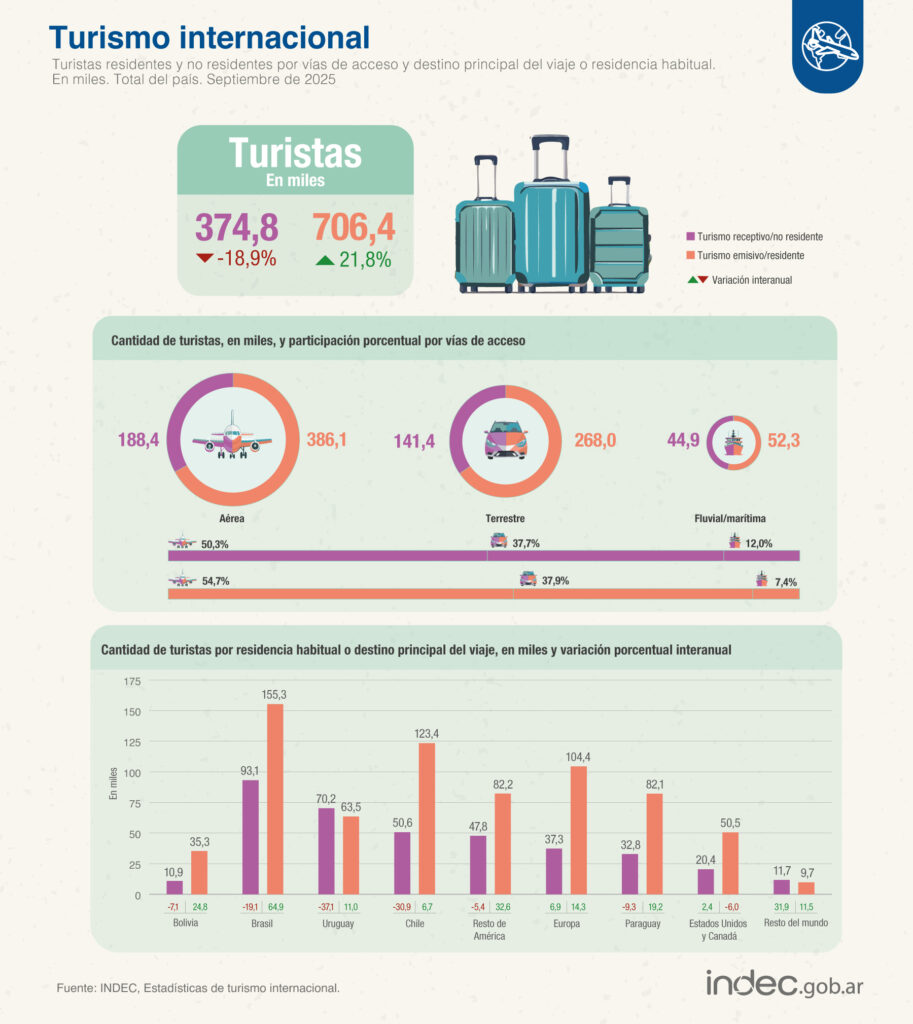 El movimiento aéreo refleja la tendencia: los arribos por esta vía cayeron 6,7% interanual, con 188.400 turistas no residentes. En sentido contrario, las salidas aumentaron 28,1%, alcanzando 386.100.