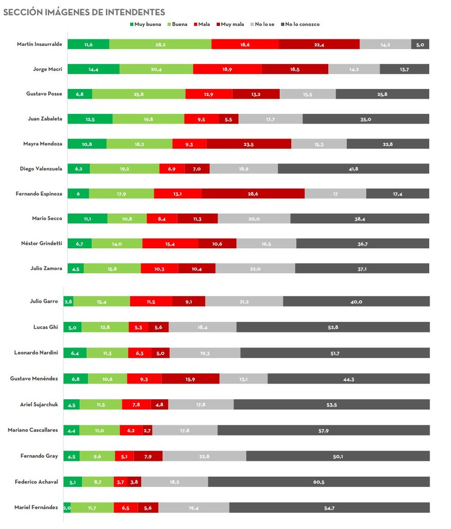 En tanto que otros referentes de Juntos, como el intendente de Vicente López, Jorge Macri obtiene una imagen positiva del 34,8% y una negativa del 27,4%; y su par de San Isidro, Gustavo Posse, una positiva del 32,6% y negativa de solo 26,1%.