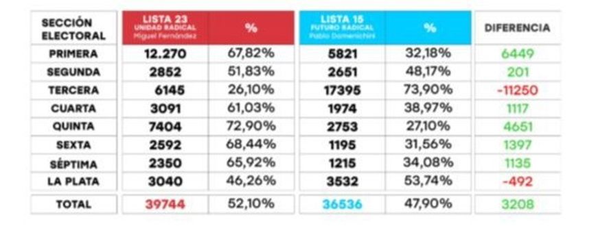 El triunfo de la Lista 23 se evidenció en el conteo final, donde logró un total de 39.744 votos frente a los 36.536 obtenidos por la Lista 16, lo que se traduce en una diferencia del 4%. Este resultado fue fundamental para asegurar la victoria en seis de las ocho secciones electorales. La fuerza del radicalismo se hizo notar en distritos clave como la Primera, Quinta, Sexta y Séptima sección, mientras que la Lista 16 se impuso en la Tercera y Cuarta secciones.