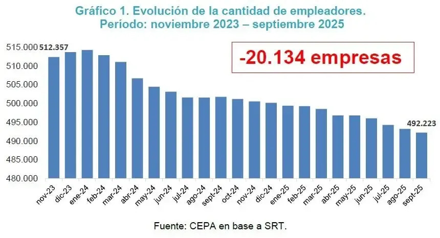 El deterioro del empleo formal también se refleja en el tejido empresarial. Entre noviembre de 2023 y septiembre de 2025, la cantidad de empleadores con personal registrado se redujo en más de 20 mil, lo que equivale al cierre de unas 30 empresas por día. Este fenómeno da cuenta de un proceso de ajuste profundo que impacta especialmente en pymes y economías regionales.