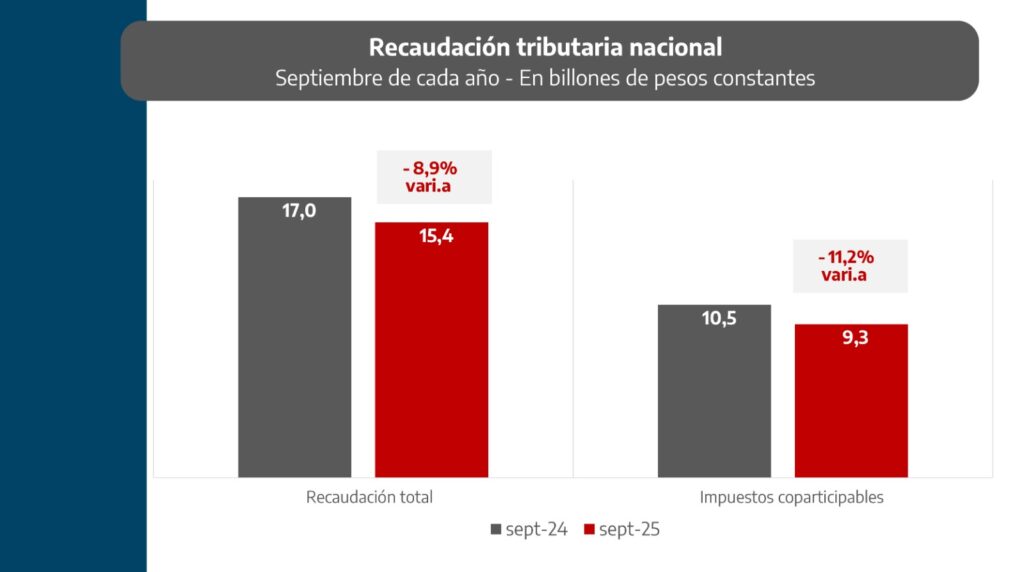Según el reporte de la ARCA, los impuestos coparticipables generaron 9,3 billones de pesos en septiembre de este año contra los 10,5 del mismo mes del año pasado. En términos reales, es decir teniendo en cuenta la inflación, se trata de una caída del 11,2%.