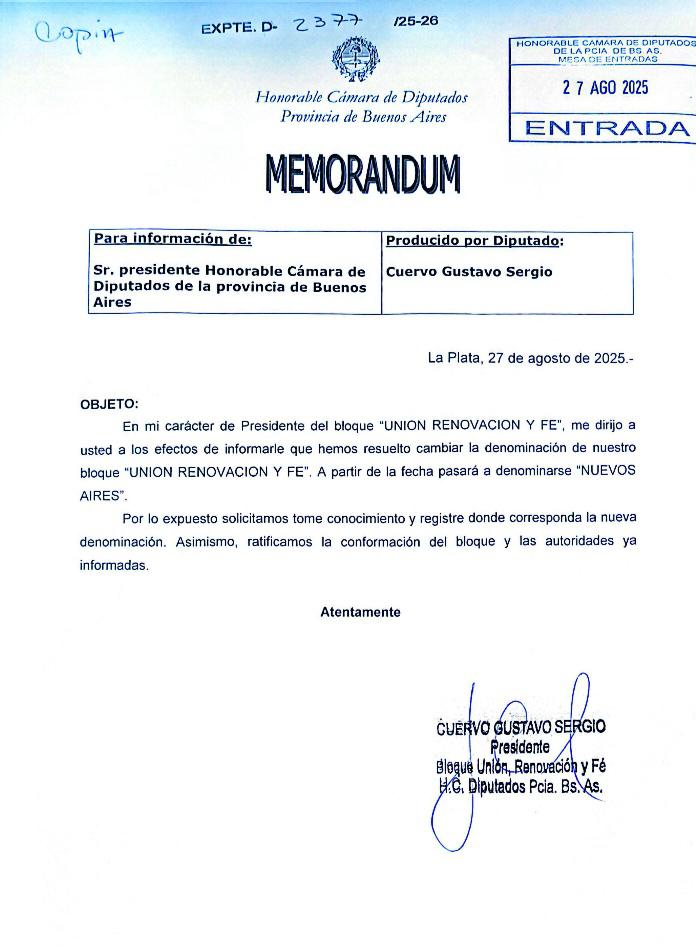 En la Legislatura bonaerense se volvió a mover el tablero político, casi un clásico después de cada cierre de listas cuando los bloques legislativos ajustan sus denominaciones para adecuarlas a los nuevos acuerdos electorales. Ese fue el caso del hasta ayer Unión Renovación y Fe, que desde esta semana pasará a llamarse “Nuevos Aires”, según informó su presidente, el diputado Gustavo Cuervo, en un memorándum dirigido a las autoridades de la Cámara baja.