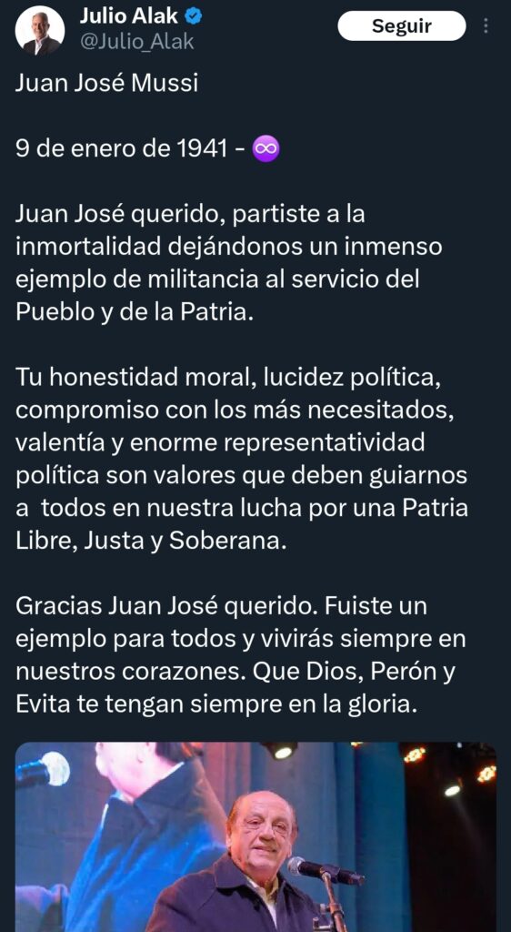 La primera en hacerlo público fue Cristina Fernández de Kirchner, quien escribió en X: “Me acaban de comunicar el fallecimiento del Dr. Juan José Mussi. Gran e histórico Intendente de la localidad bonaerense de Berazategui. Peronista de toda la vida”. También envió un mensaje de acompañamiento a su hijo Patricio, otro nombre fuerte del distrito.