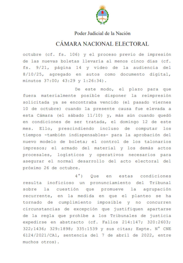 El tribunal consideró que los plazos legales y técnicos se encuentran vencidos, y que la solicitud de reeditar las boletas (presentada por los apoderados libertarios tras la renuncia de Espert y otros dos candidatos) es de “cumplimiento imposible”. Según el fallo, el proceso de diseño, aprobación e impresión de las BUP “ya estaba precluído” al momento del pedido.