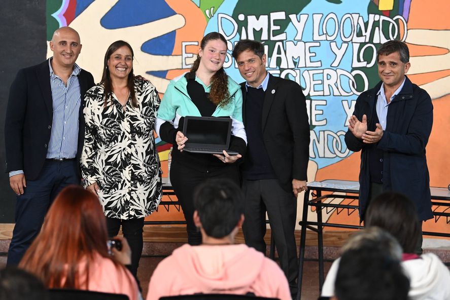 El gobernador de la provincia de Buenos Aires, Axel Kicillof, encabezó este miércoles el acto de entrega de 168 netbooks para estudiantes de ocho instituciones educativas secundarias del municipio de Lobería, en el marco del programa Conectar Igualdad Bonaerense.
